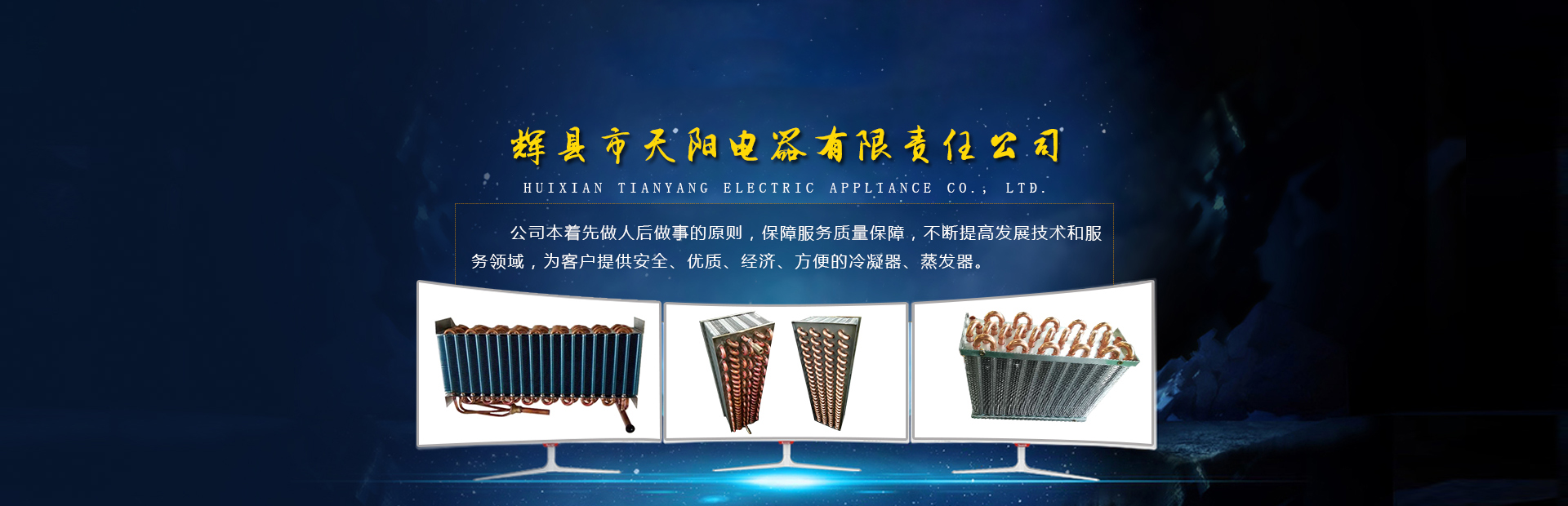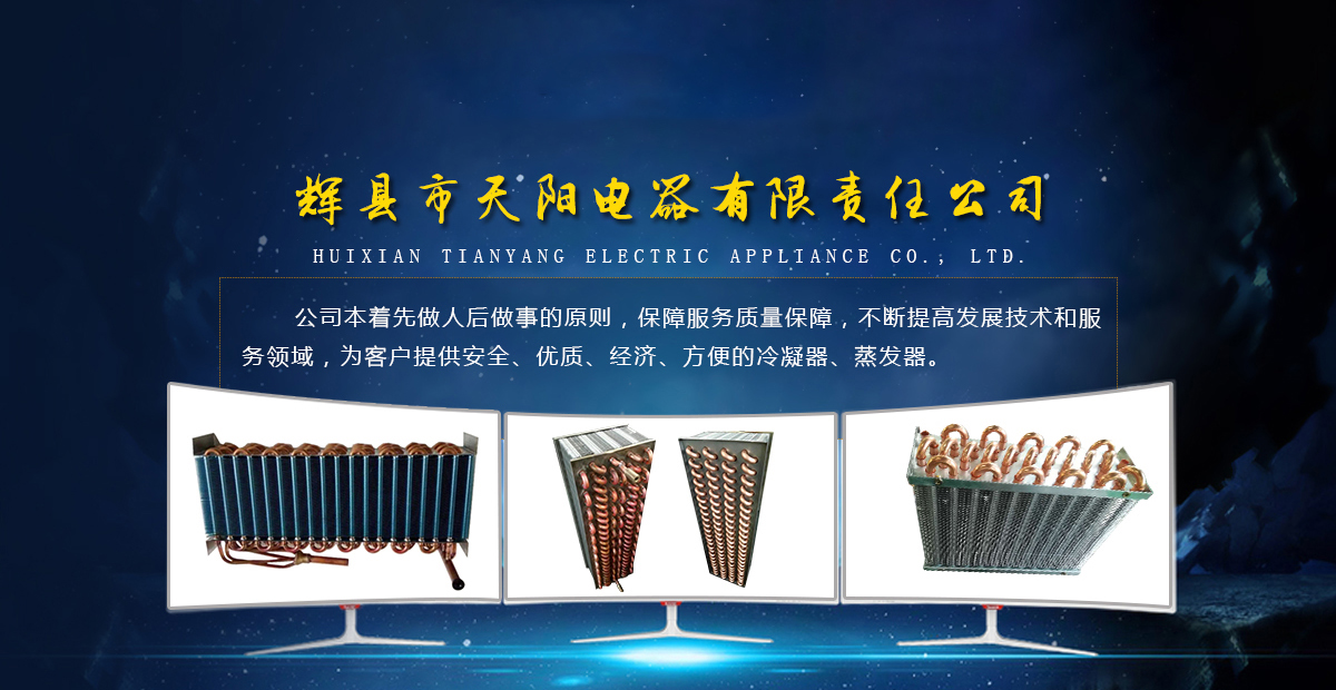 輝縣天陽電器有限責(zé)任公司位于肥沃的中原河南省輝縣市學(xué)院路中段工業(yè)集聚區(qū)興業(yè)園3號廠房,以制冷設(shè)備用冷凝器,蒸發(fā)器,熱交換器為主。主要材料為銅管鋁翅片,銅管銅翅片,鋁管鋁翅片。廣泛應(yīng)用于冰箱冰柜,制冷設(shè)備,暖通設(shè)備,空調(diào),自動售貨機(jī),冷干機(jī),超市立風(fēng)柜,冷藏車,烘干機(jī)等產(chǎn)品領(lǐng)域?! 」咀?998年成立以來,始終堅(jiān)持:“科技造就產(chǎn)業(yè)、質(zhì)量成就信譽(yù)、誠信鑄就輝煌”的質(zhì)量方針,從產(chǎn)品拓展上堅(jiān)持“人無我有,人有我優(yōu),人優(yōu)我特的”經(jīng)營理念,25年來,從1998年開始供應(yīng)河南冰熊集團(tuán)下屬的冷柜廠,制冰機(jī)廠各種冷凝器;2003年之后,原冰熊集團(tuán)的精英志士開始在全國各地發(fā)展,所到之處依托我公司供貨,以致于多家目前已具行業(yè)中佼佼者的公司,從而建立了如凱雪公司,兆邦公司、凌云公司、海寶公司、正雪公司、上海忠云、山東德萊維等幾十余家公司在草創(chuàng)時期的啟蒙供貨商,友好共贏長達(dá)十余年,成為我國制冷行業(yè)的供應(yīng)商。以致在2015年初雙匯集團(tuán)面向社會的招標(biāo)書中指名要我公司冷凝器、蒸發(fā)器指定產(chǎn)品供應(yīng)商